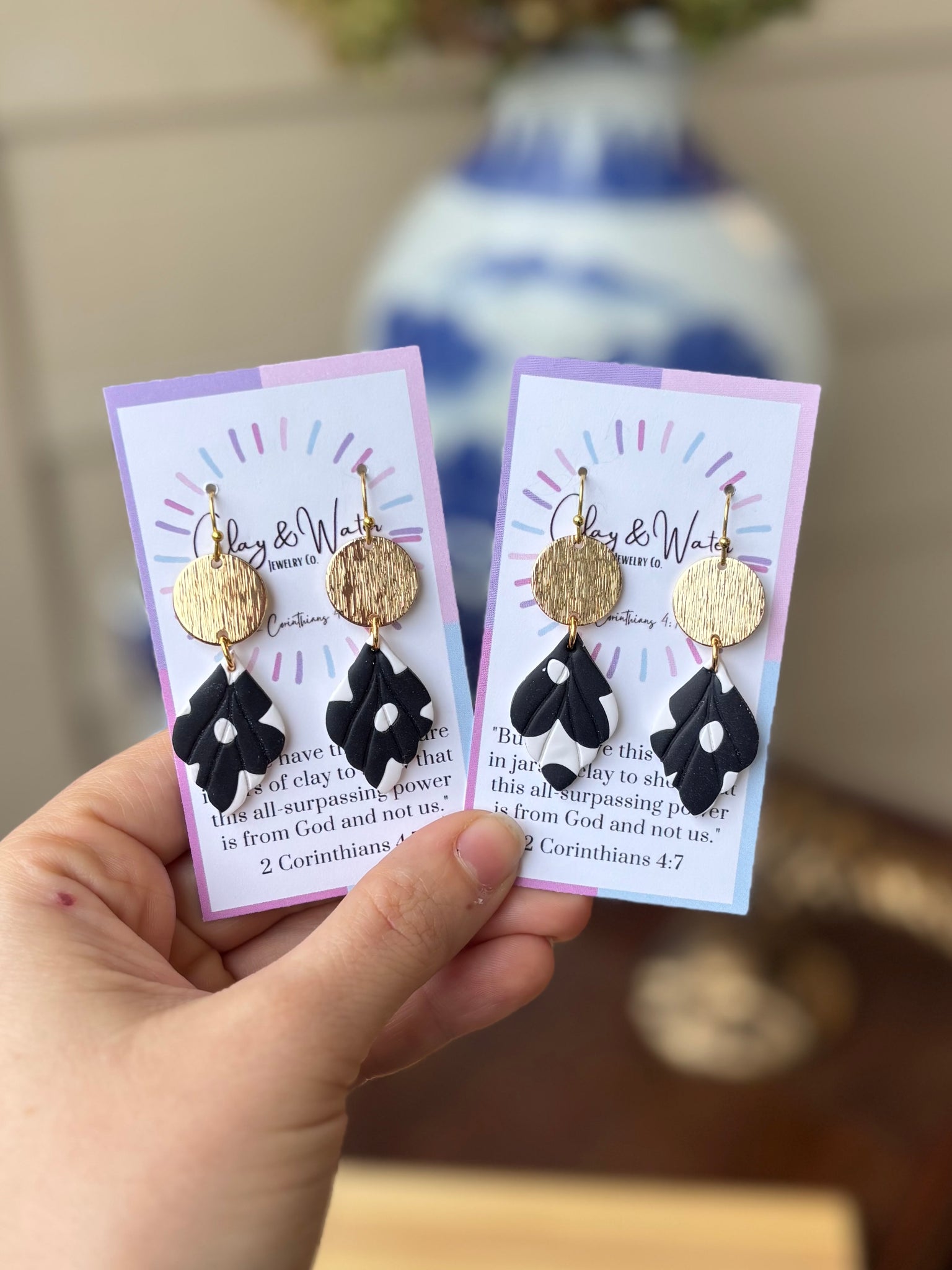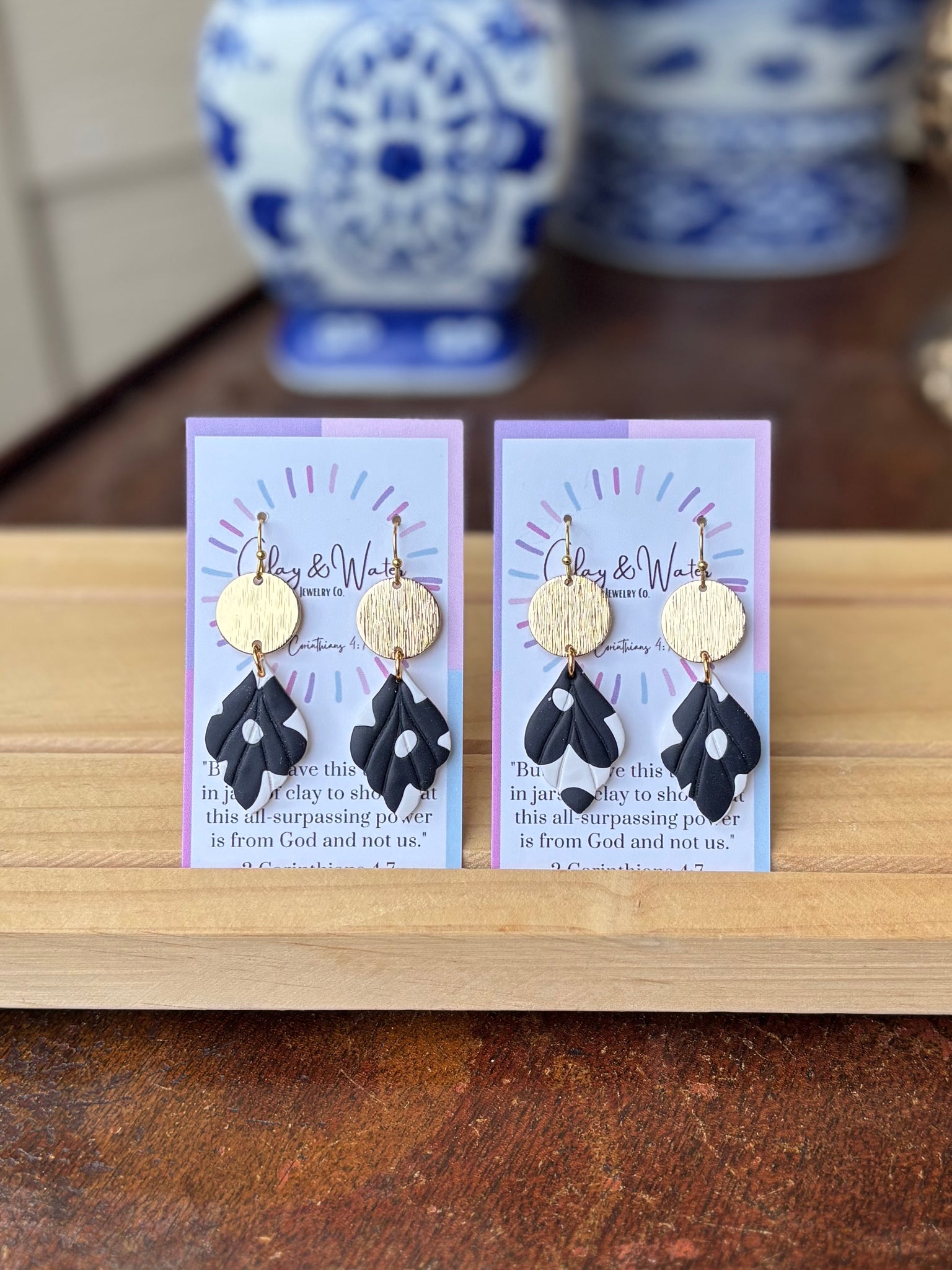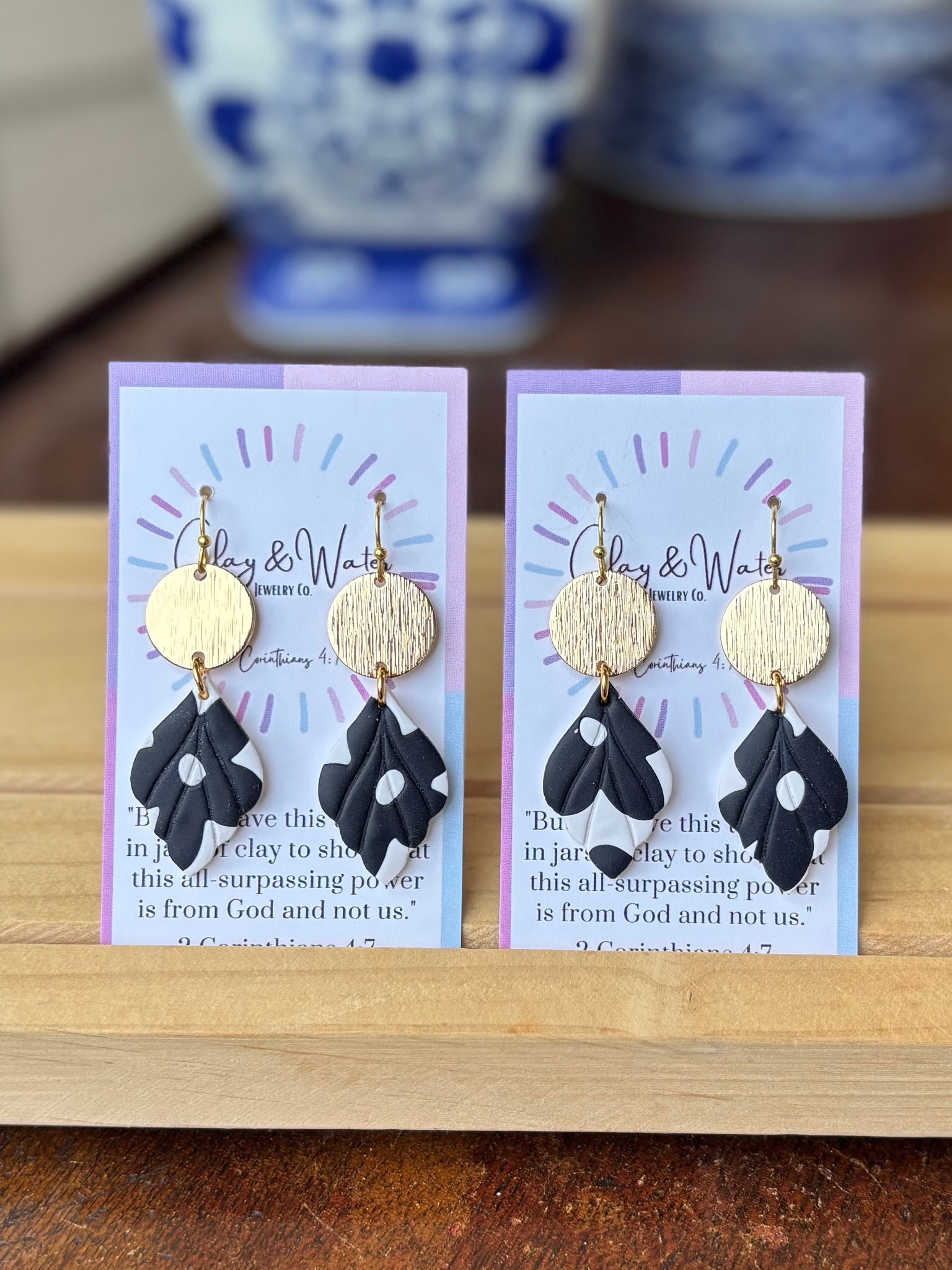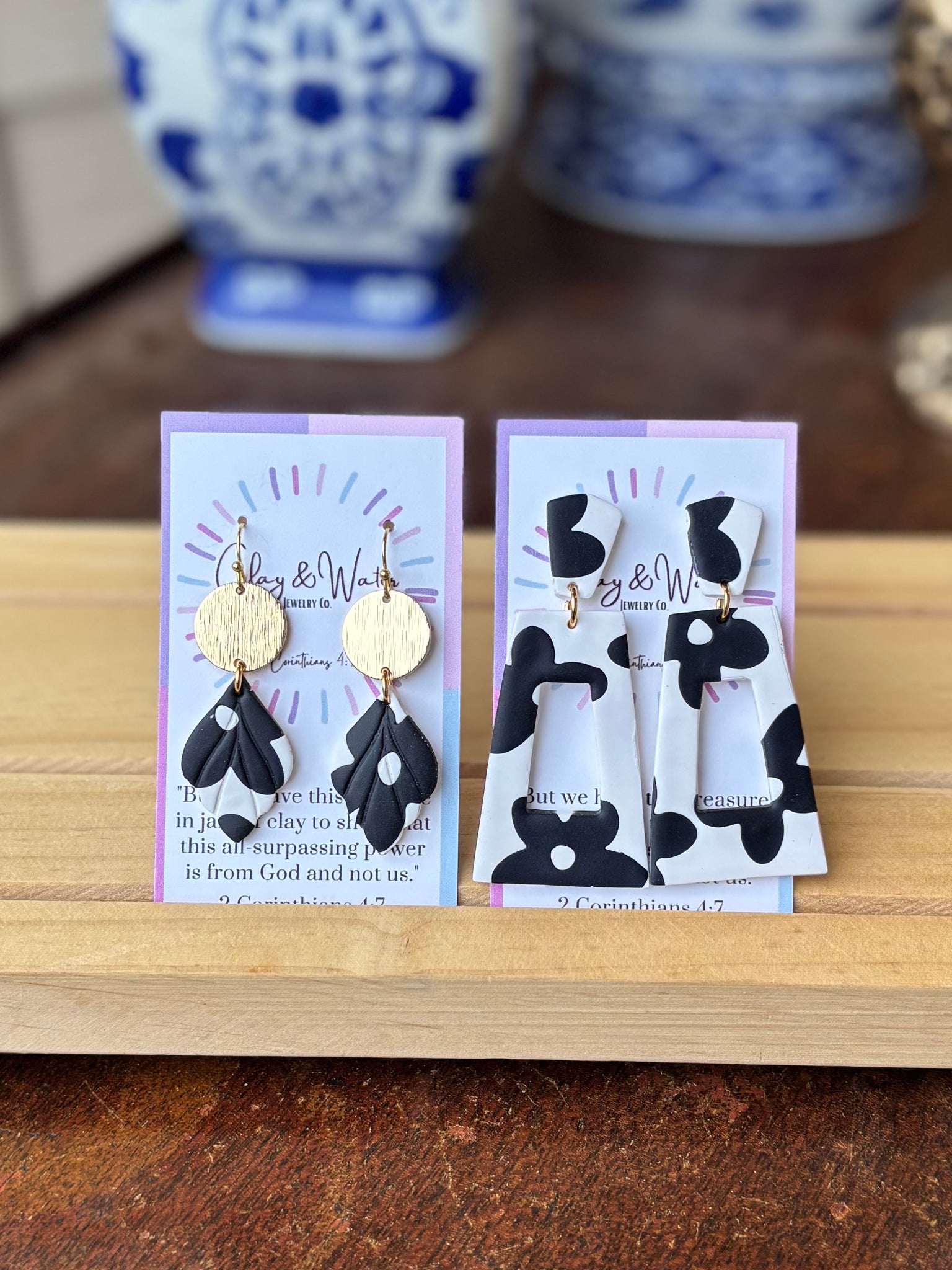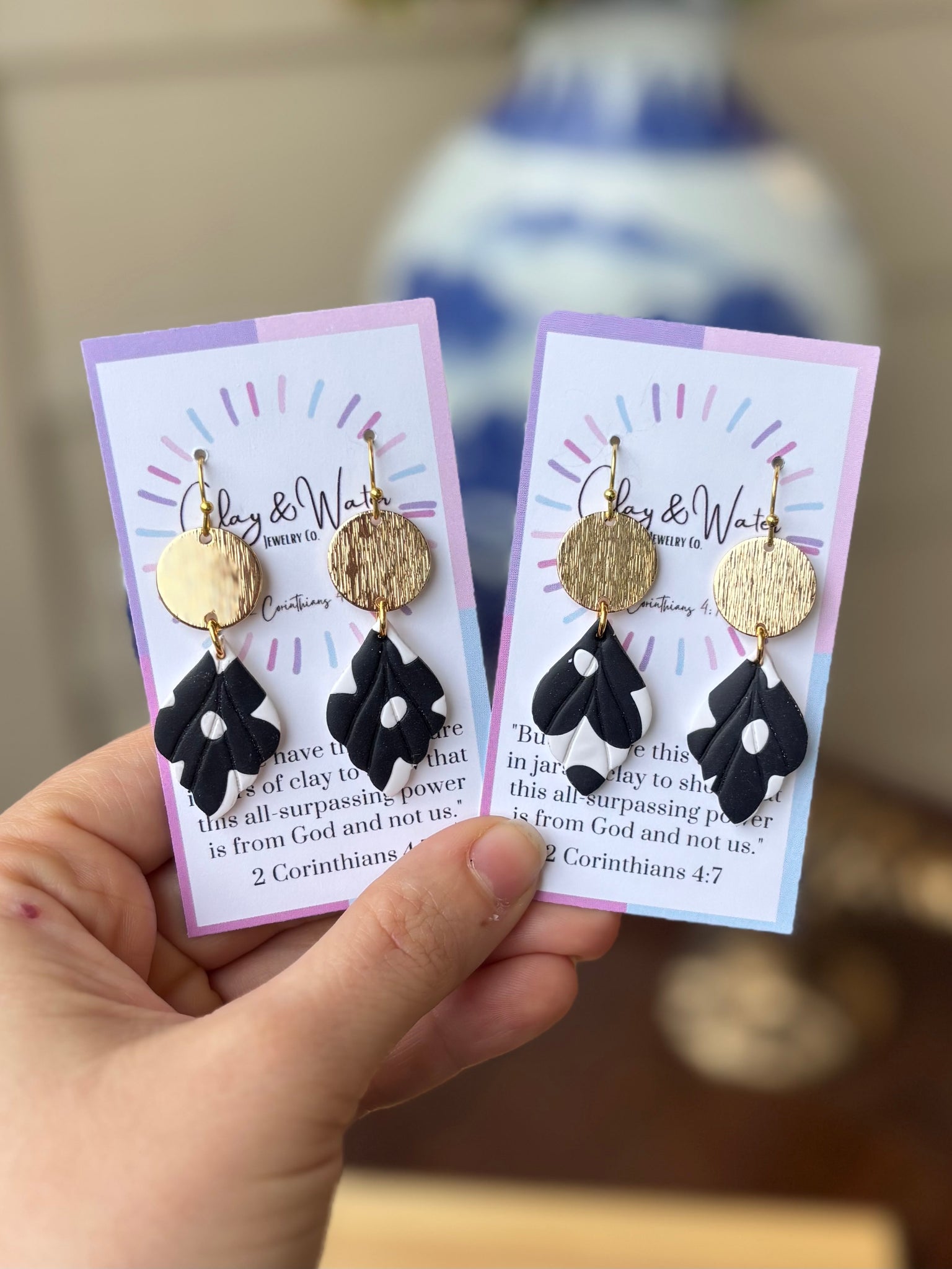 These white and black earrings are a staple accessory, featuring a flower imprint design.