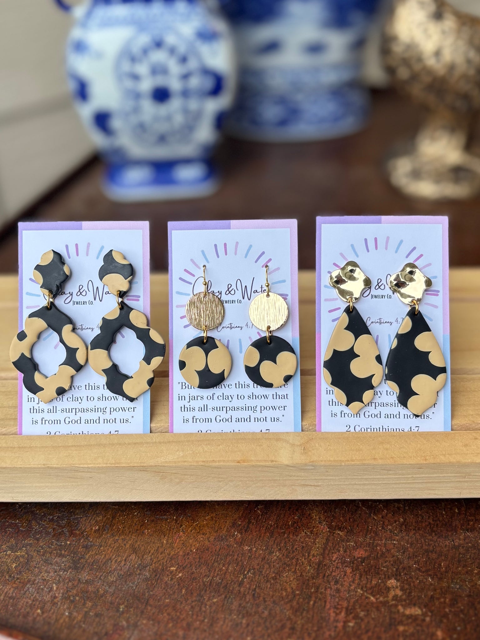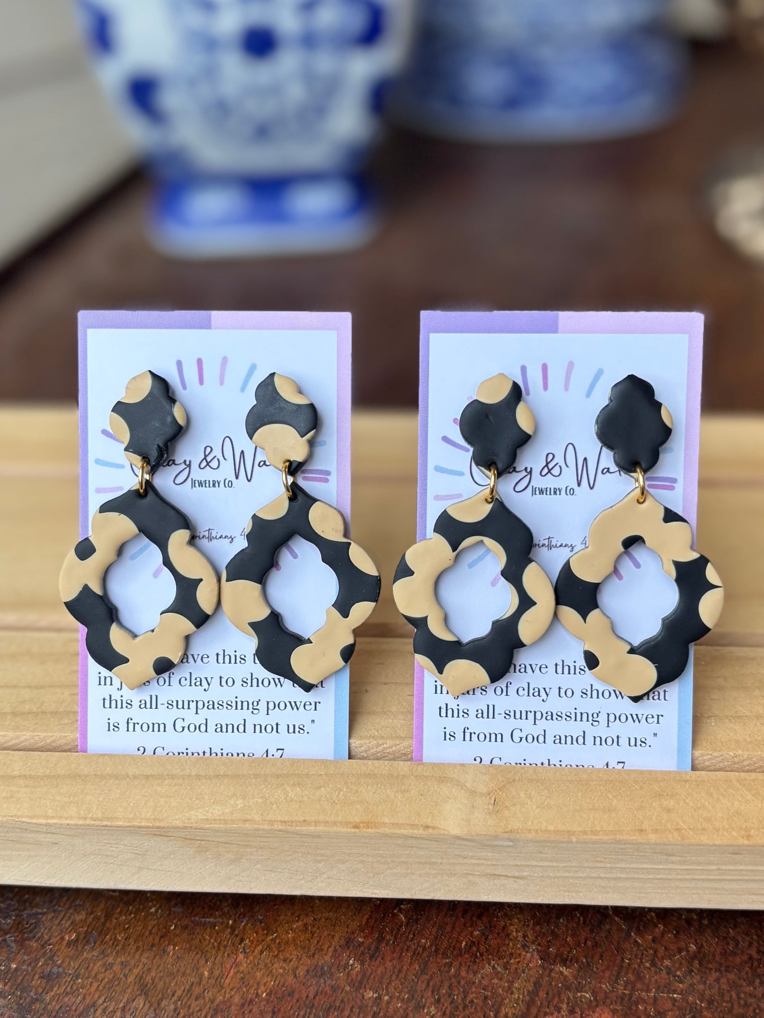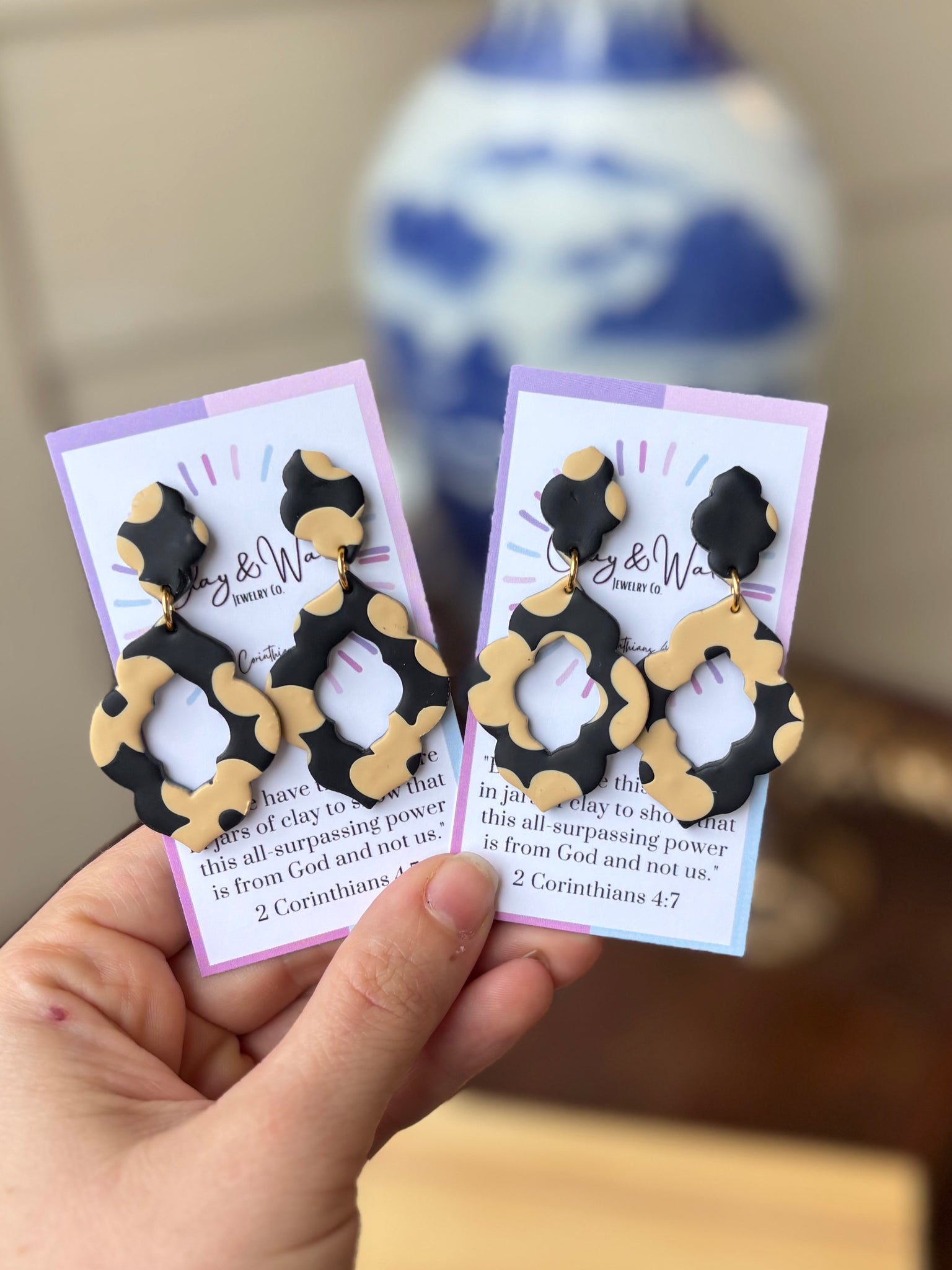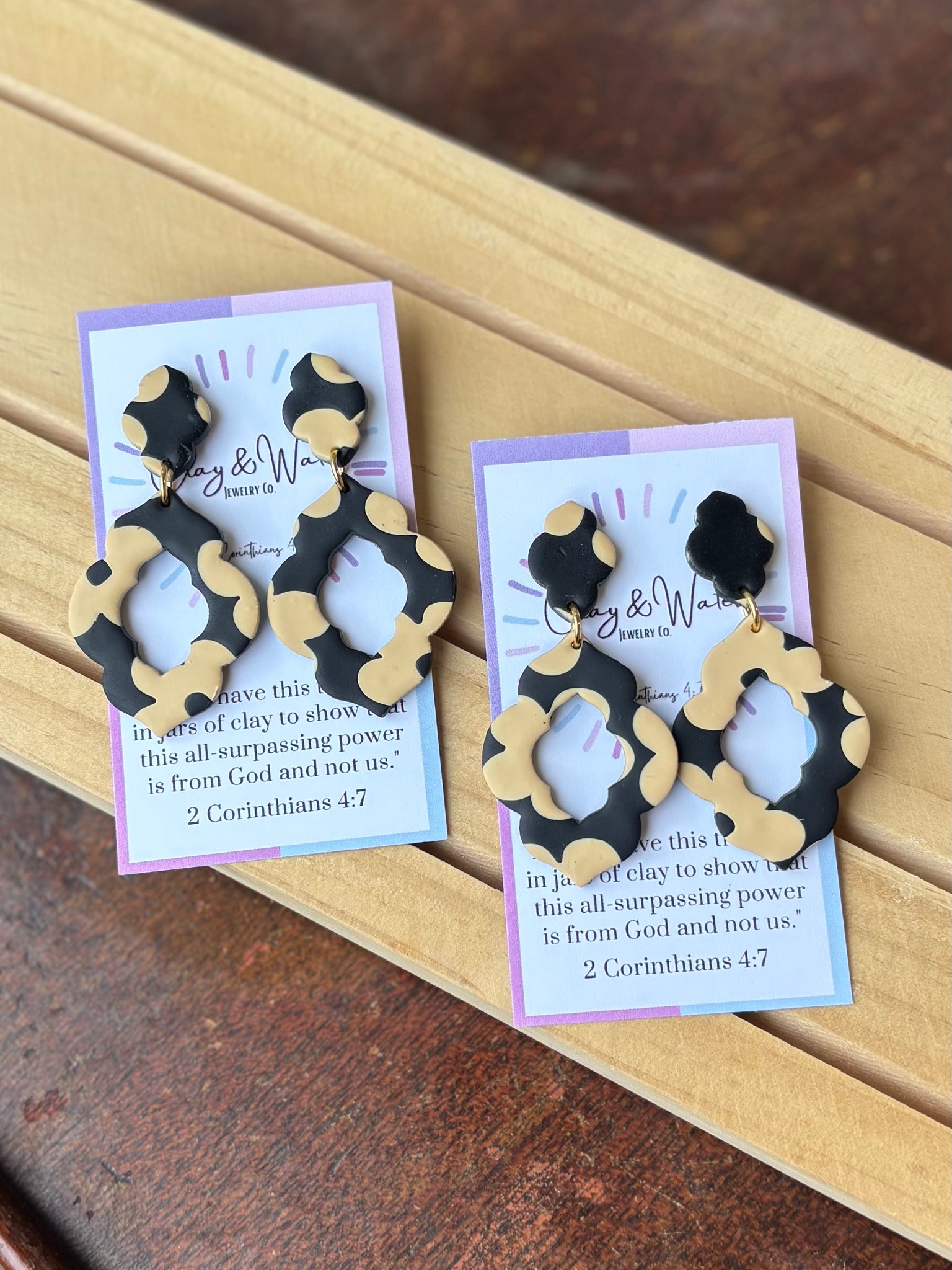 These ecru and black earrings are a staple accessory, featuring a flower imprint design!